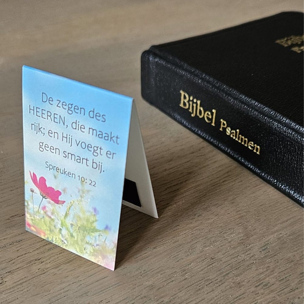 Deze bladwijzer of boekenlegger met magneet is speciaal ontwikkeld voor dunne bladzijdes en daarmee uitermate geschikt als Bijbellegger. Het formaat is 4 cm breed en 6 cm hoog en is aan beide zijden bedrukt. De ene zijde presenteert de tekst, den andere zijde is enkel de afbeelding.