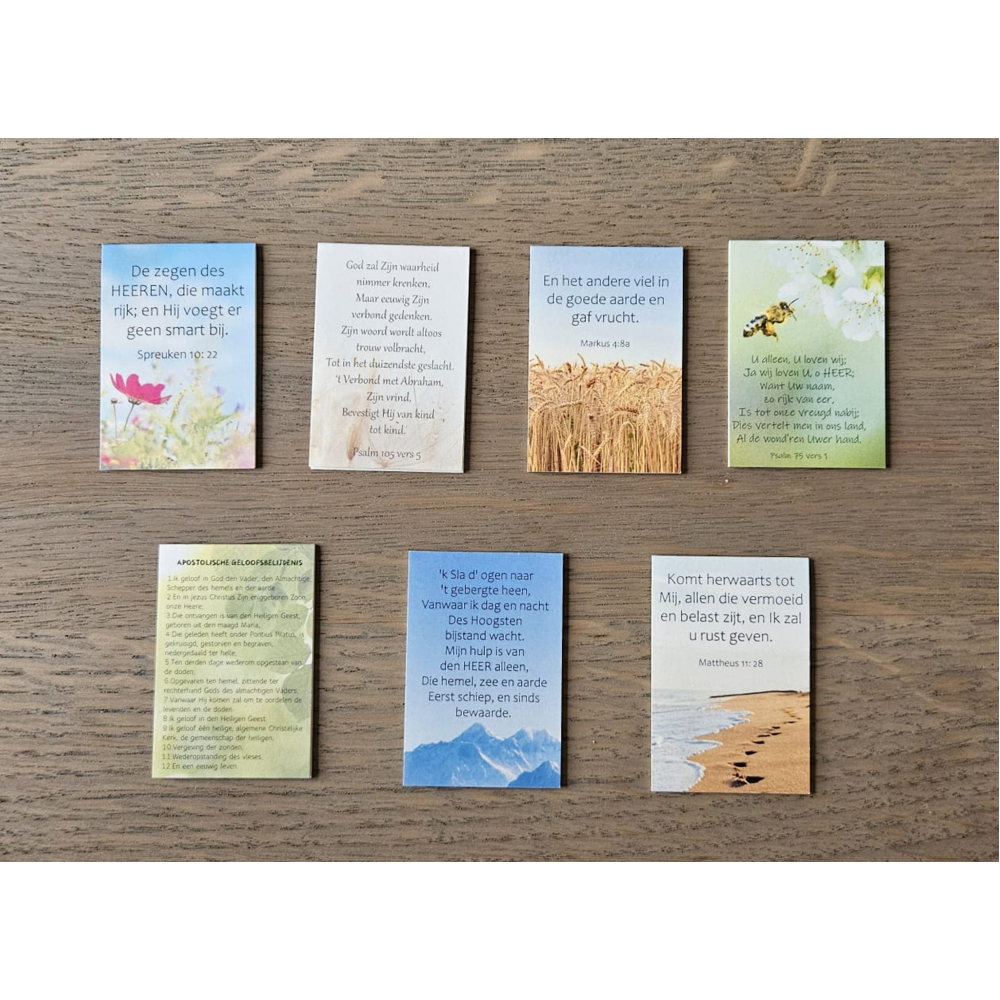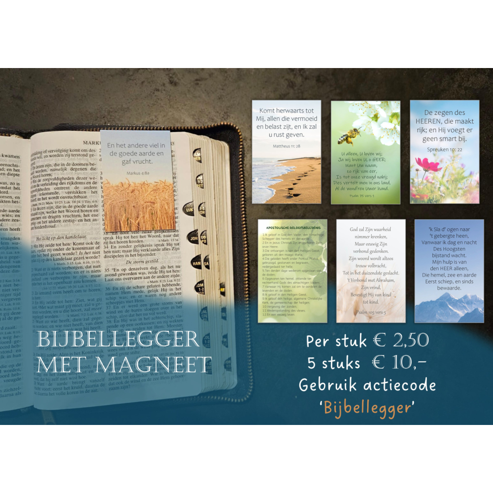 Deze bladwijzer of boekenlegger met magneet is speciaal ontwikkeld voor dunne bladzijdes en daarmee uitermate geschikt als Bijbellegger. Het formaat is 4 cm breed en 6 cm hoog en is aan beide zijden bedrukt. De ene zijde presenteert de tekst, den andere zijde is enkel de afbeelding.
