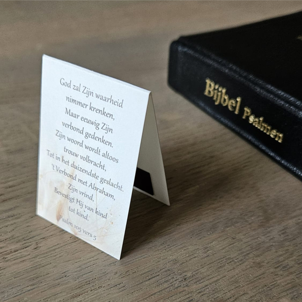 Deze bladwijzer of boekenlegger met magneet is speciaal ontwikkeld voor dunne bladzijdes en daarmee uitermate geschikt als Bijbellegger. Het formaat is 4 cm breed en 6 cm hoog en is aan beide zijden bedrukt. De ene zijde presenteert de tekst, den andere zijde is enkel de afbeelding.